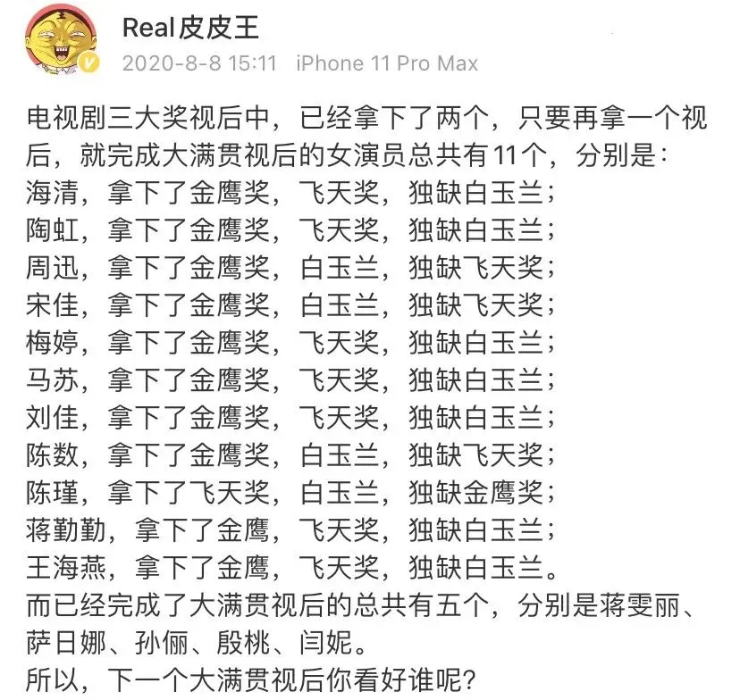 要被称作大青衣,必须拿下国内重量级电视剧奖的视后,比如飞天、白玉兰等主流奖项。